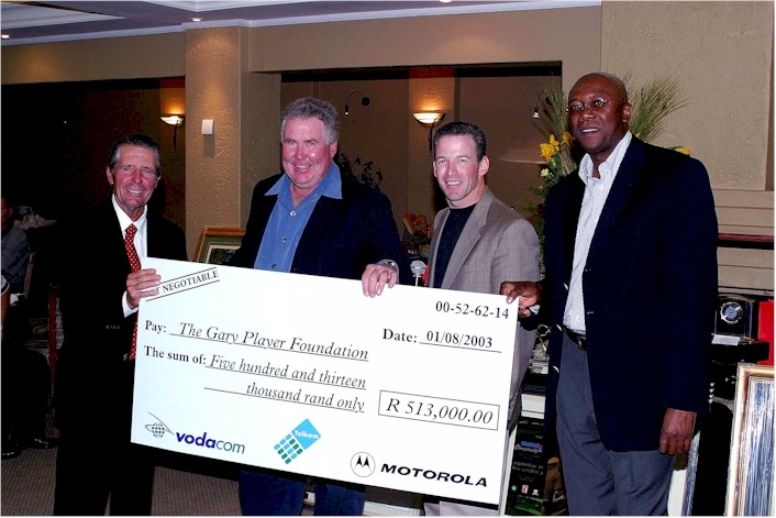Bill Hearmon presenting a cheque to the Gary Player foundation. From left to